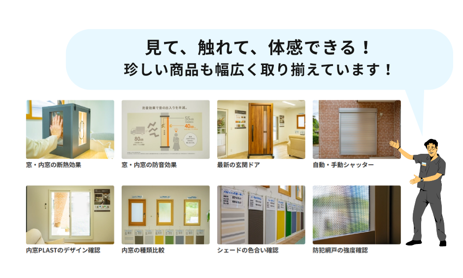 フクシマ建材は全国的にも珍しい商品を幅広く取り揃えています。防音性の高い「内窓プラスト」「エコアマド」防犯網戸「ソリッドフロー」や外付けブラインド「ブリイユ」など、他ではなかなか見られない商品が多数あります。「わざわざでも見に行きたい」と思っていただける場所として、ショールームをもっと活用していきたいと思います。