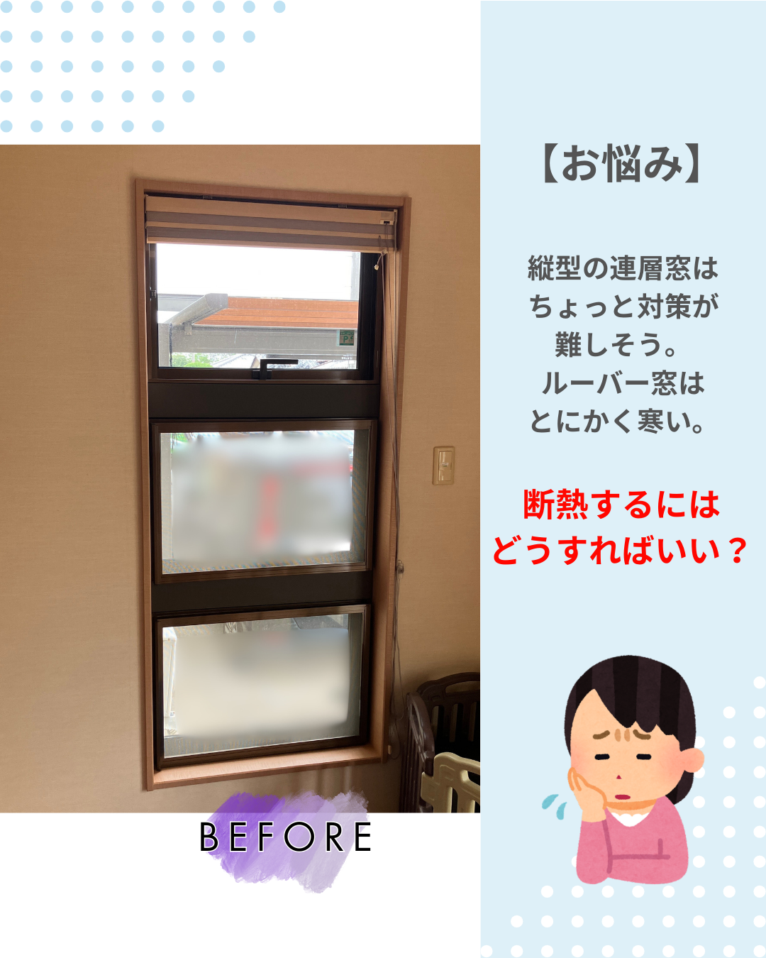 ルーバー窓がとにかく寒いし、連層窓はちょっと珍しいタイプ。断熱したいけどどうにかして!