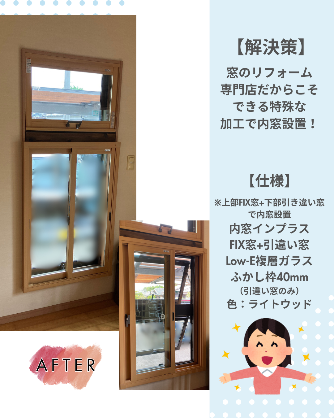 ※上部FIX窓+下部引き違い窓で内窓設置