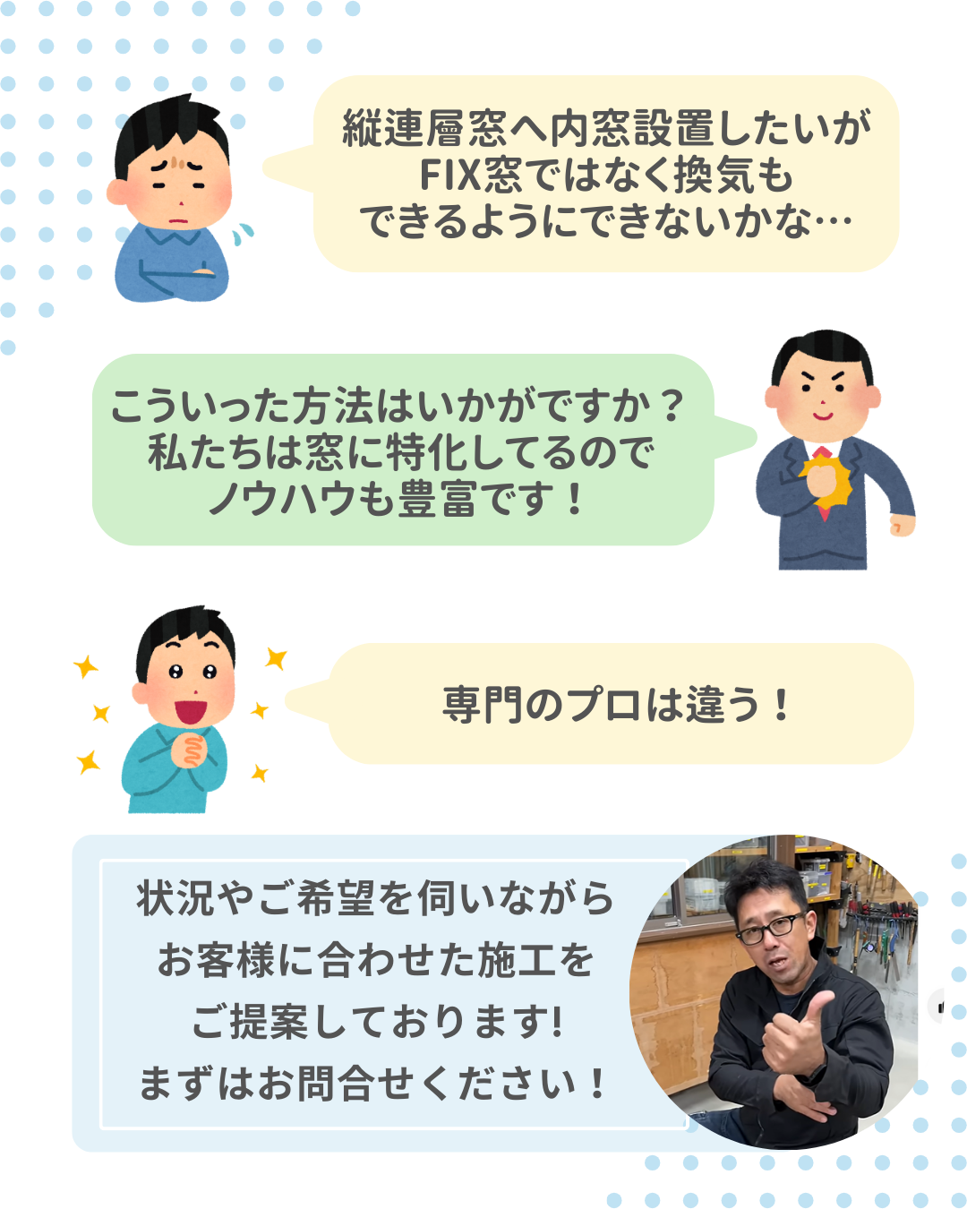 もし、内窓の設置を断られたというご経験のある方、一度フクシマ建材にご相談くださいませ。設置可能なご提案を検討させていただきます! 調査・見積りは無料にて行っております。まずはお気軽にお問い合わせくださいませ。