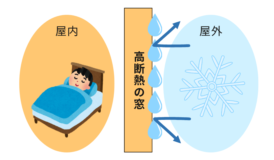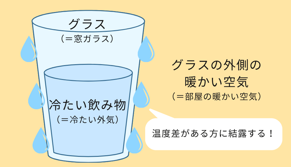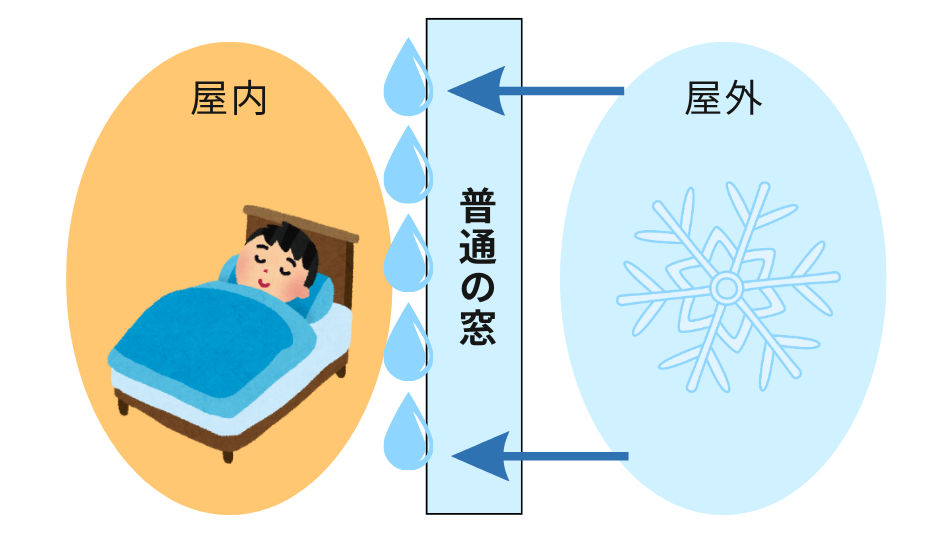 普通の窓だと、室内の暖かい空気がガラスを通して外に伝わり、外側のガラスがそこまで冷えません。