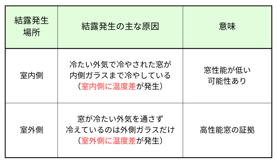 ・窓の外側結露は、性能が高い窓ほど起こりやすい現象。