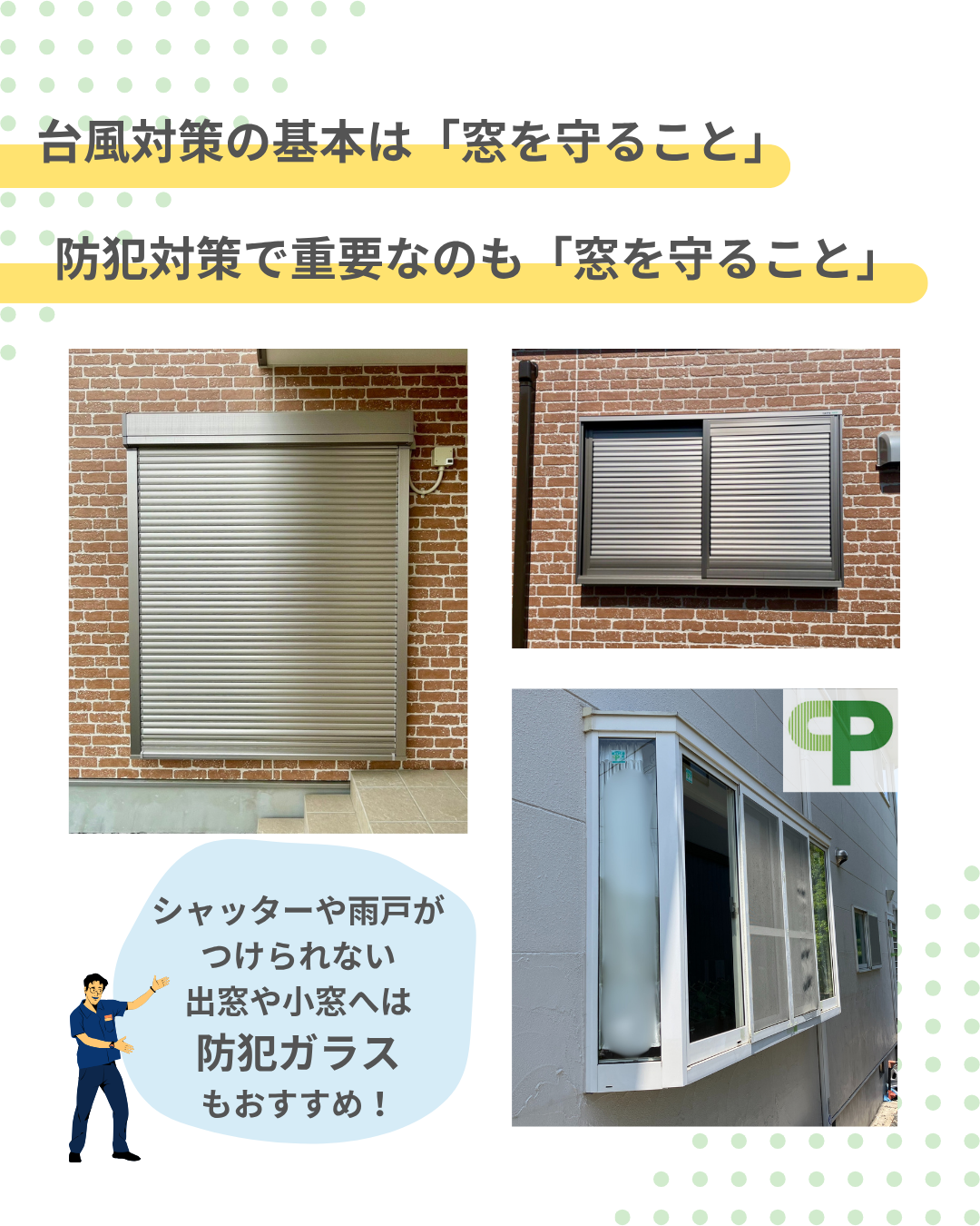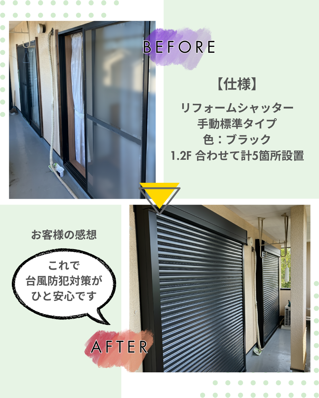 今回のご依頼主さまからも「これで台風防犯対策がひと安心です。」とのお喜びのお声をいただきました。