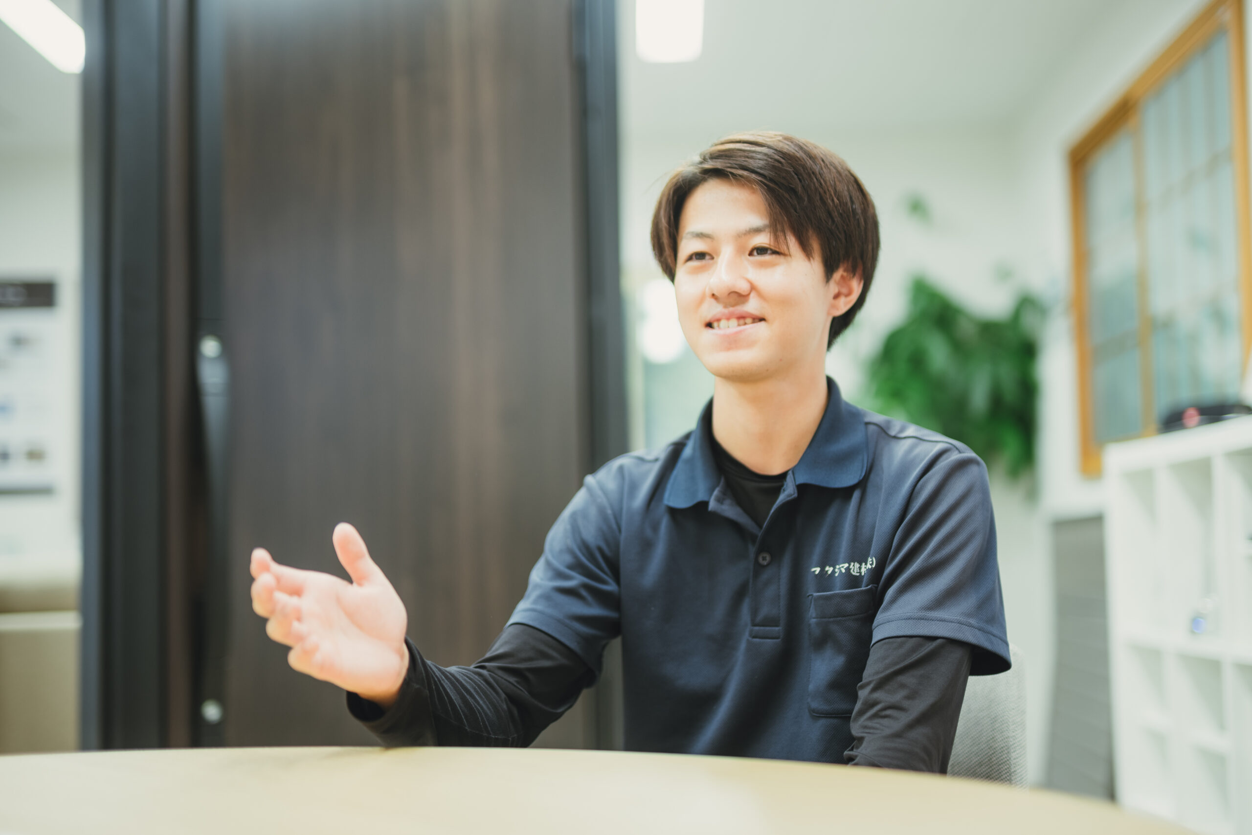 【木村】実はリフォーム会社の求人を他にもいくつか見つけていて、それぞれどのような会社かを調べていたんです。その中で、「フクシマ建材」はSNSでの情報発信が活発で、どのような人がどのような仕事をしているかが明確で、とても安心感がありました。それで面接に赴いたところ、他の社員の雰囲気も見ることができました。ガタイがよい人などもいて、いわゆる「職人の職場」という怖い感じなのかな?と少し心配だったのですが、実際に話してみるとすごく優しく接してくれてホッとしました(笑)。「すごく働きやすそうだな」という印象を持ちましたね。