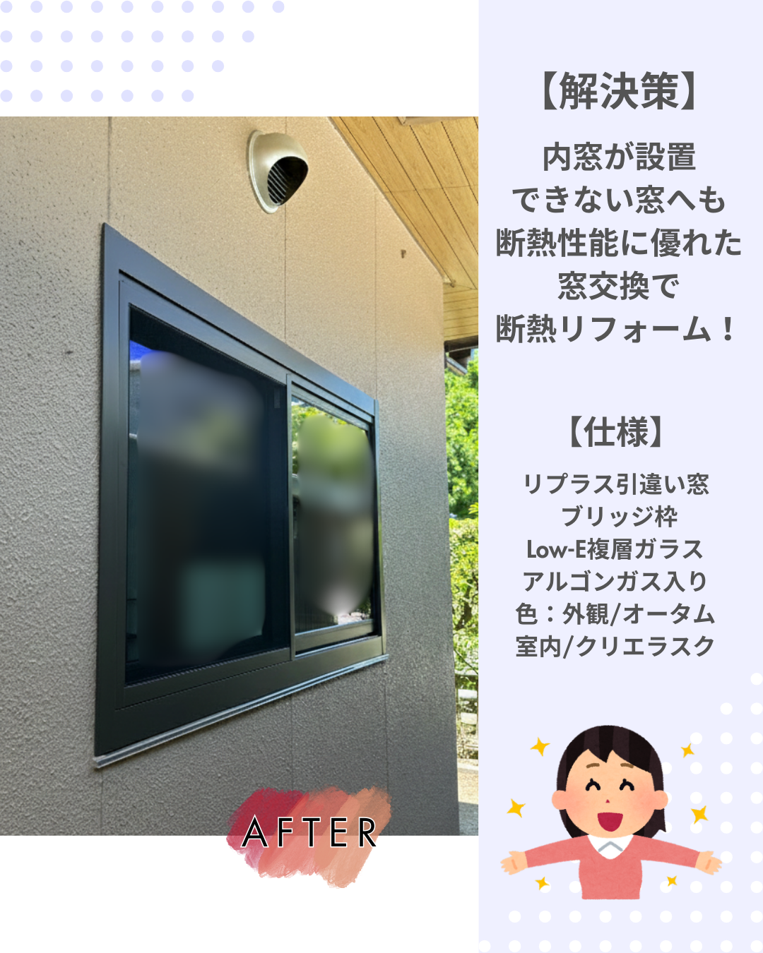 以前も弊社にご依頼いただいたOBの方からのご依頼。今回は、寒さ対策で窓リフォームをご検討でしたが、キッチンの窓は内窓が取付け不可だったため、窓交換をご提案し施工することになりました。