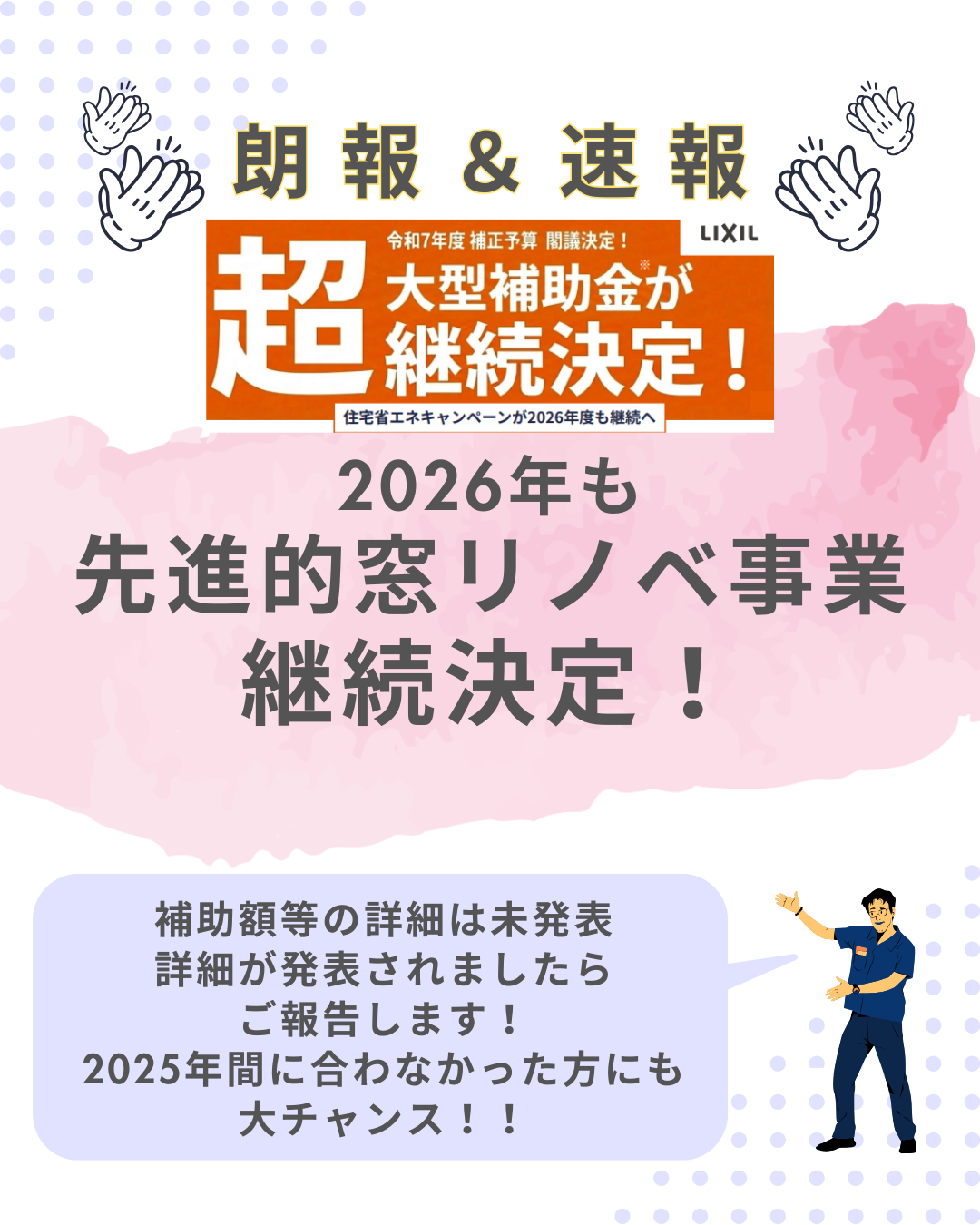 なお、先日、2026年も持続可能な社会の実現のために、断熱窓リフォームに対する大型補助金が出ることが発表されました!詳細はまだ未発表ですが、去年しそびれてしまった方も、リベンジの大チャンス到来!