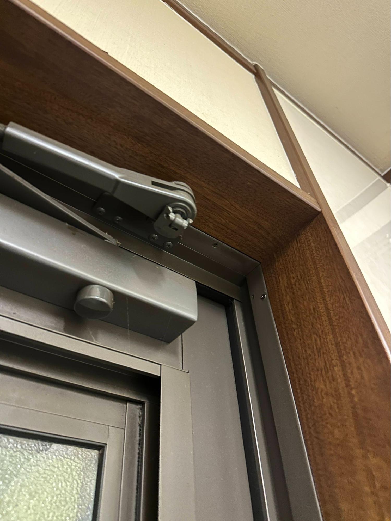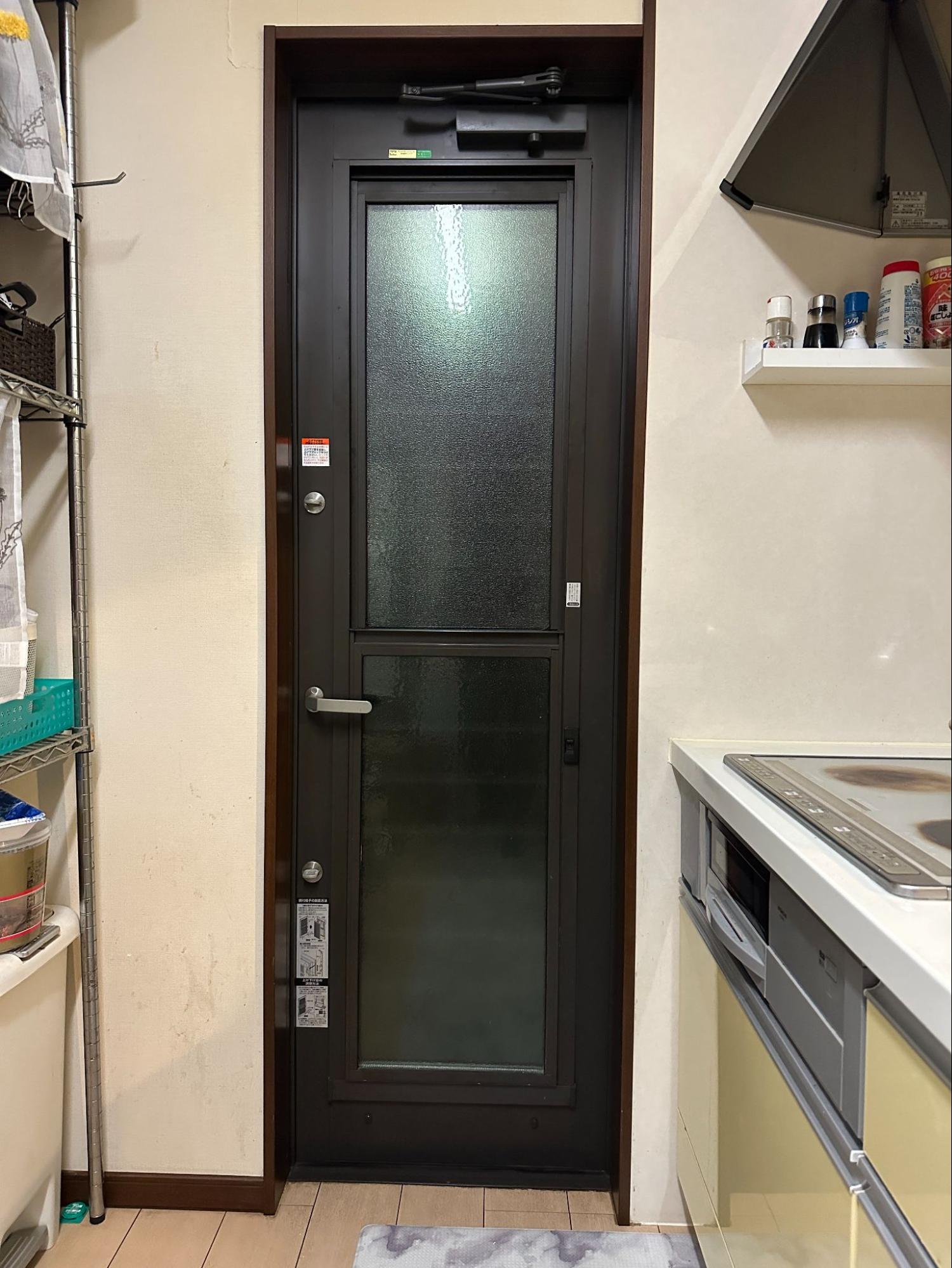 ☑️ドアクローザーが邪魔:勝手口の上部には、ドアを自動で閉める「ドアクローザー」というものが付いています。内窓を付けるには、これを避けるために「ふかし枠」という部材で、窓枠を室内側に大きく出っ張らせる必要があります。またはいっその事、このドアクローザーを取り外してしまって、木枠(額縁)の中に内窓を設置してしまうという方法もあります。