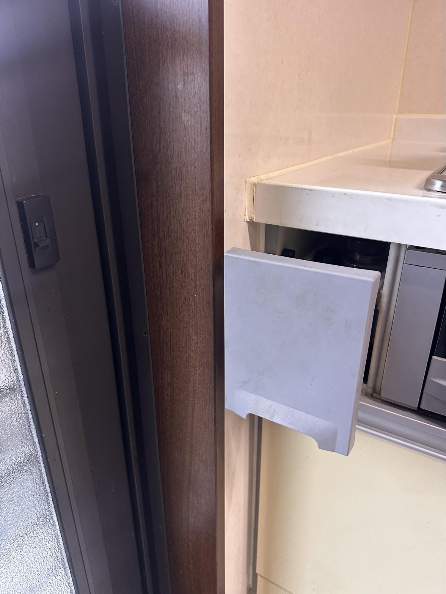 ☑️キッチンの引き出しと干渉する:ふかし枠が室内側に出っ張ることで、近くのシステムキッチンの引き出しが開かなくなる可能性が高くなります。実際のキッチンの写真です。現在、勝手口の木枠スレスレにキッチンの棚が開くようになっています。ここにふかし枠を設置すると、棚が開かなくなってしまいます。